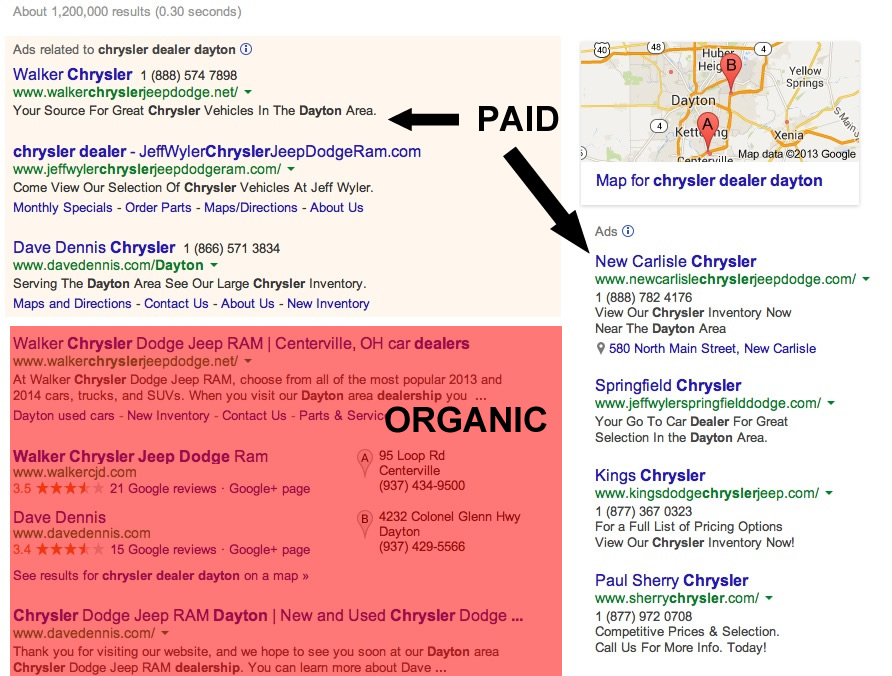 This picture shows the main organic listings below the ads. The top couple of results and the results in the sidebar are paid listings via Google Adsense. (It’s nice to be listed in the paid ads as well as organic – you’re sort of getting in people’s faces in two different ways, which is really nice. But more on that later.)